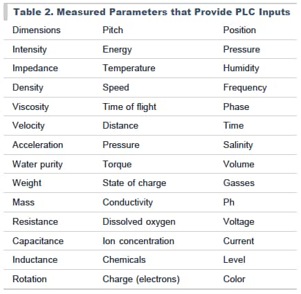 Table 2 summarizes how PLC and signal-chain basics begin once we sense something, usually a physical parameter. Then PLC