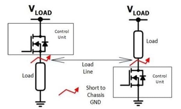High-side SmartFETs have become the dominant SmartFET configuration in the automotive market, replacing the generally simpler low-side SmartFET. Figure 1 shows an example of a high-side versus low-side SmartFET configuration. While a high-side SmartFET’s load always connects to the ground with a switched connection to the supply, a low-side SmartFET’S load always connects to the power supply with a switched connection to GND. The SmartFET is typically housed inside a control unit or ECU. The load line is the cable length that connects the load to the pin connector on the ECU. Depending on the load type and its location in the vehicle, this load line could belong, thereby increasing the likelihood of a short to chassis ground which could be a severely stressful condition for the load in a low-side SmartFET configuration. This makes the high-side SmartFET the preferred choice for load switching.