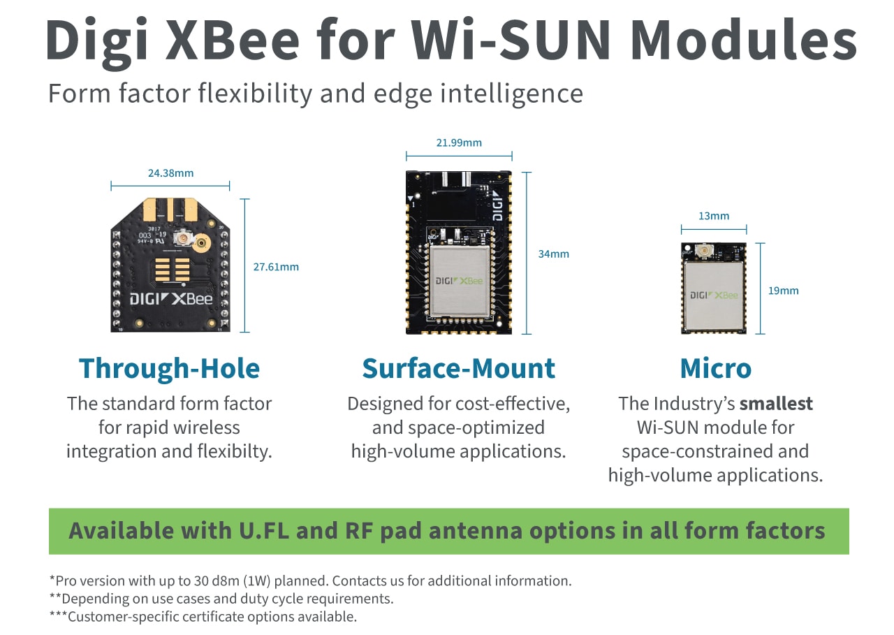 Figure 3: Wi-SUN LFNs and FFNs can be implemented using the range of Digi XBee modules. Different form factors target rapid integration, high-volume, and space-constrained applications. (Source: Digi International Inc.)