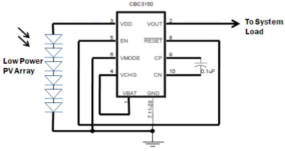 • Photovoltaic (PV) panel that converts ambient light energy into electrical energy, which is fed into the CBC3150 device